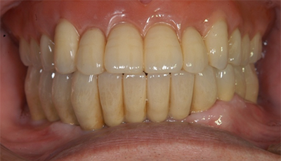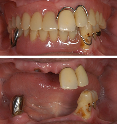 上は総義歯、下はインプラントブリッジによって 咬み合わせを回復しています。